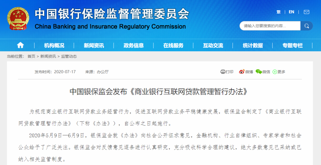 7月17日,据银保监会官网披露,为规范商业银行互联网贷款业务经营行为,促进互联网贷款业务平稳健康发展,银保监会制定了《商业银行互联网贷款管理暂行办法》(下称《办法》),自公布之日起施行。