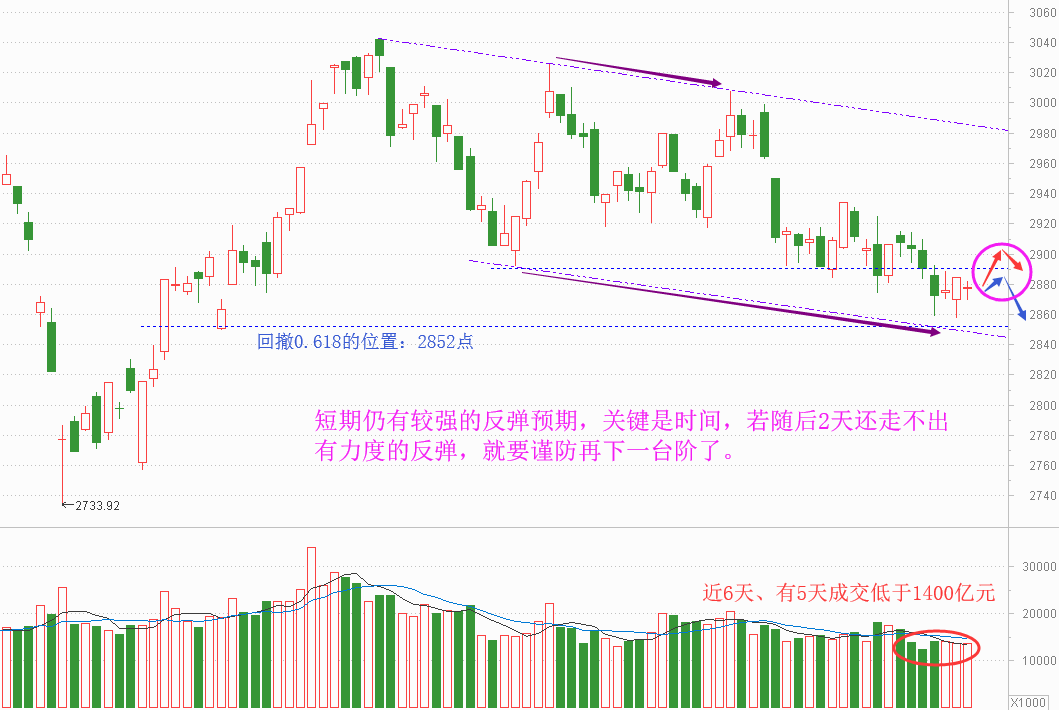 3、再回到当下行情。基于连续抗拒恐慌的止跌表现,短期仍有着较强的反弹预期,但关键是时间,因为止跌支撑的预期、一般是比较短的,如果随后2天、尤其是周四,还走不出有力度的反弹,做多信心就将重新被压制,到时就要谨防随时随地的再下一台阶了。